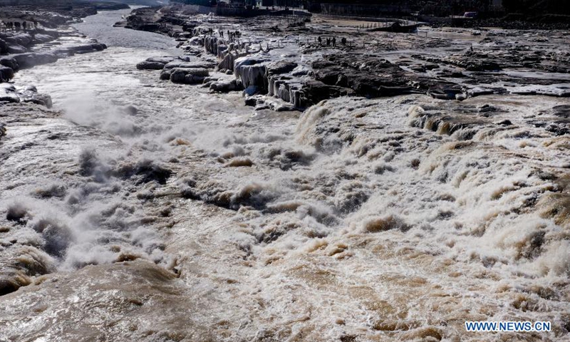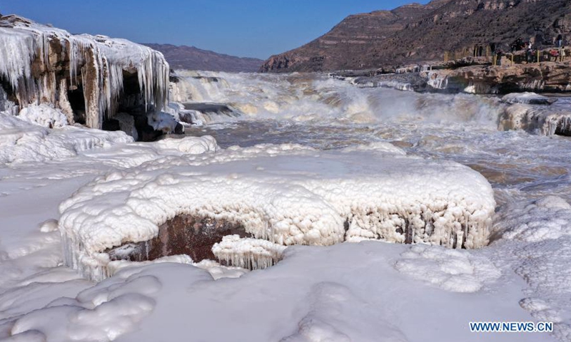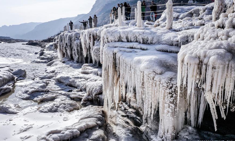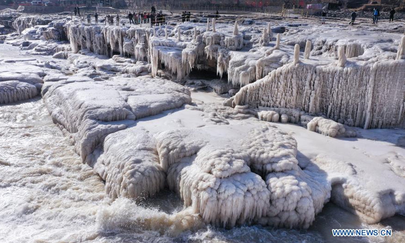Aerial photo taken on Dec. 16, 2020 shows visitors enjoying the winter scenery at the Hukou Waterfall scenic spot in northwest China's Shaanxi Province. The Hukou waterfall, located on the border area between north China's Shanxi and northwest China's Shaanxi provinces, formed spectacular winter scenery as temperature continued to drop in recent days. (Xinhua/Tao Ming)