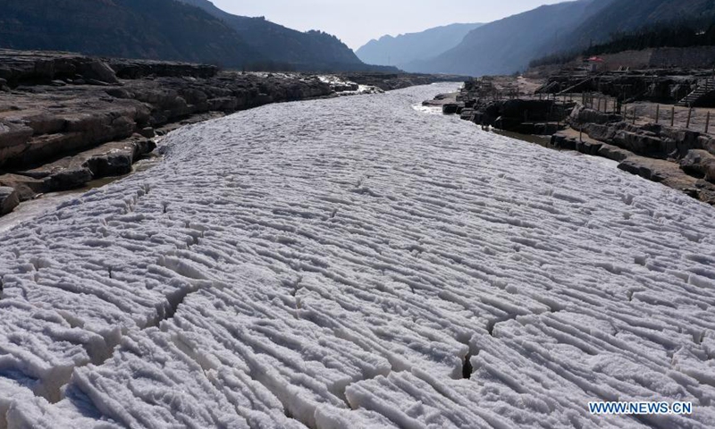 Aerial photo taken on Dec. 16, 2020 shows the winter scenery of the Hukou Waterfall scenic spot in northwest China's Shaanxi Province. The Hukou waterfall, located on the border area between north China's Shanxi and northwest China's Shaanxi provinces, formed spectacular winter scenery as temperature continued to drop in recent days. (Xinhua/Tao Ming)