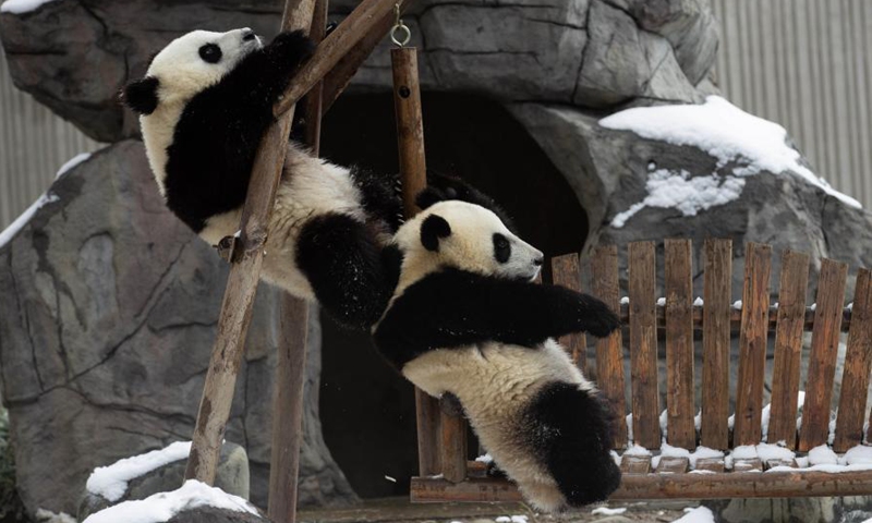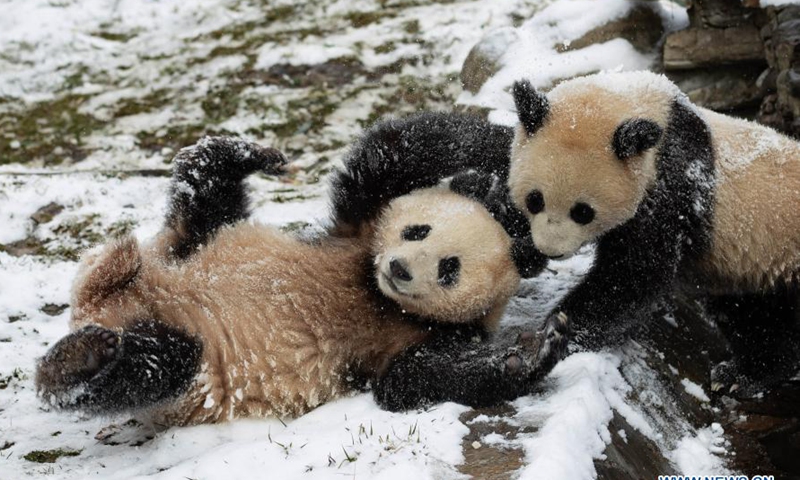 Giant pandas play after snow at Shenshuping base of China Conservation and Research Center for the Giant Panda in Wolong National Nature Reserve, southwest China's Sichuan Province, Dec. 17, 2020. (Xinhua/Jiang Hongjing)