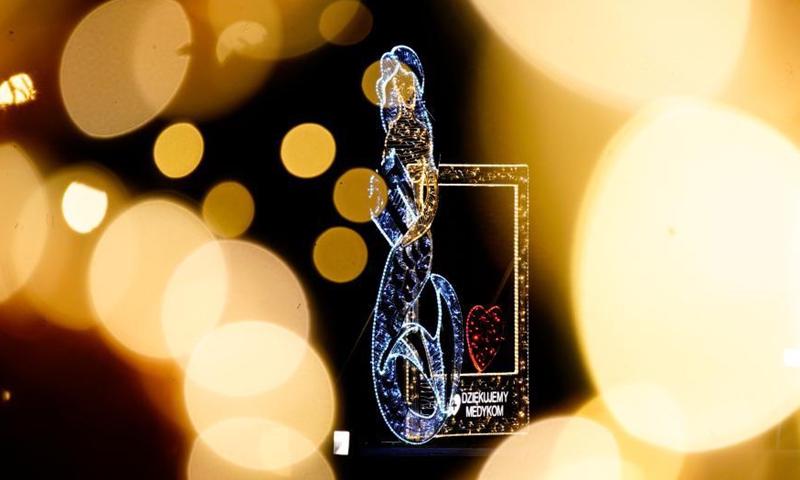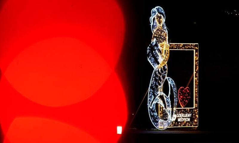 A siren, which is the symbol of the city of Warsaw, is illuminated next to a heart and the words "Thank You Medics" in Warsaw, Poland, Dec. 16, 2020. The Fountain Park in Warsaw has been illuminated with decorative Christmas lighting and two special installations have been made to thank medical workers battling the COVID-19 epidemic.Photo:Xinhua