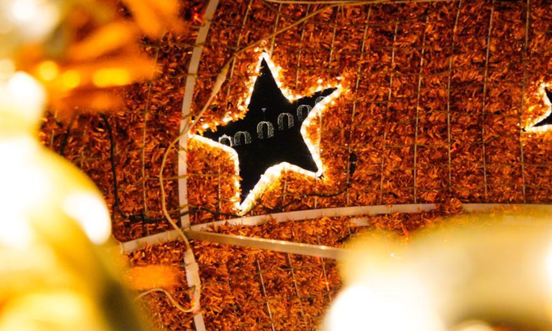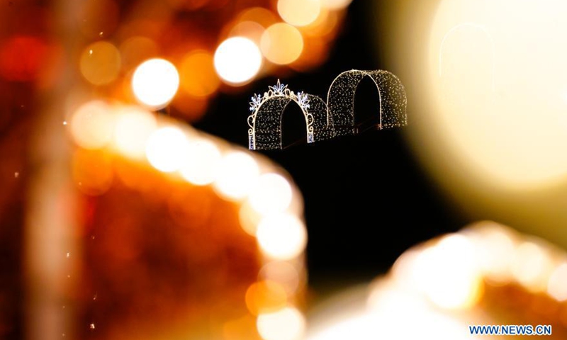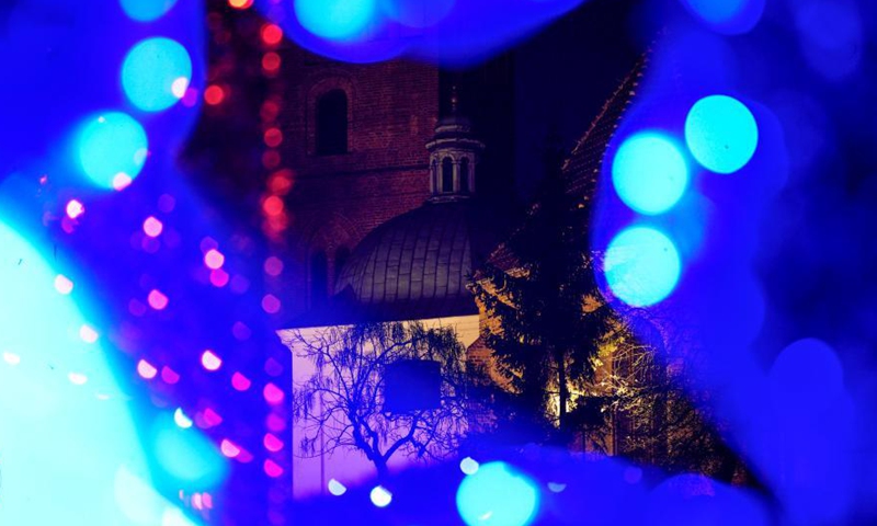 A building in the Old Town is seen through an illuminated Christmas ball in Warsaw, Poland, Dec. 16, 2020. The Fountain Park in Warsaw has been illuminated with decorative Christmas lighting and two special installations have been made to thank medical workers battling the COVID-19 epidemic.Photo:Xinhua