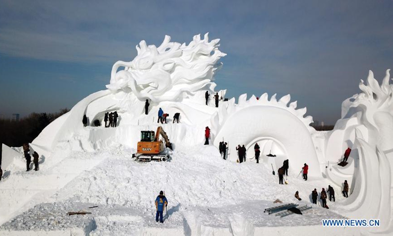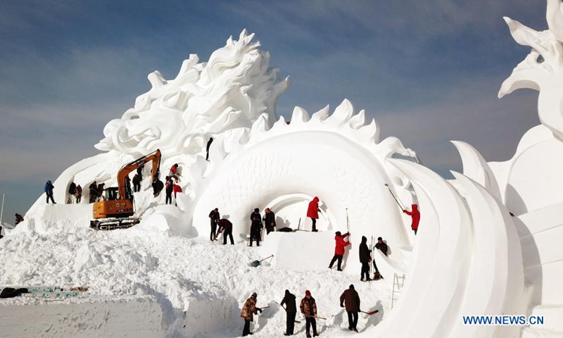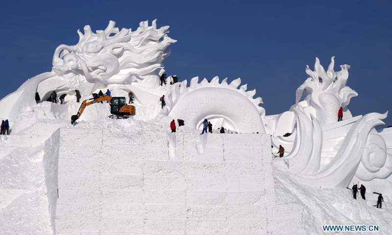Snow sculptors work on the main snow sculpture in the compound of the 33rd Harbin Sun Island International Snow Sculpture Art Exposition in Harbin, northeast China's Heilongjiang Province, Dec. 18, 2020. (Xinhua/Wang Jianwei)