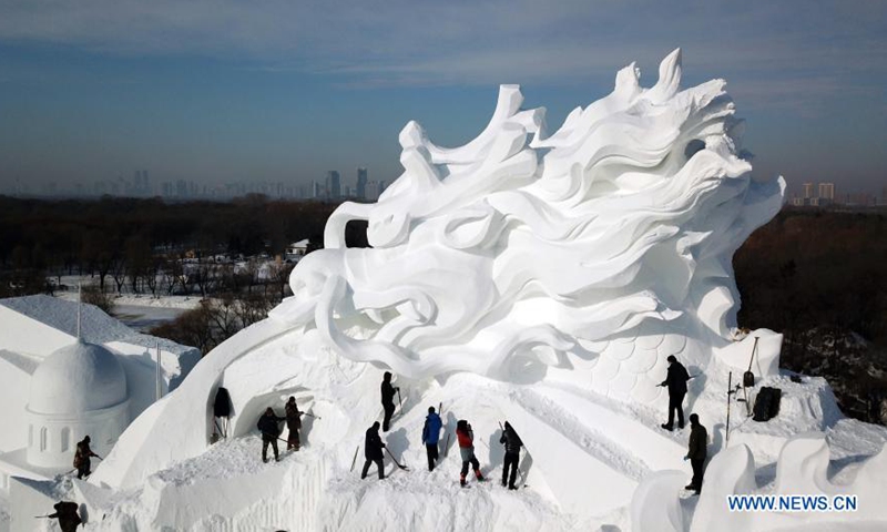 Aerial photo taken on Dec. 18, 2020 shows snow sculptors working on the main snow sculpture in the compound of the 33rd Harbin Sun Island International Snow Sculpture Art Exposition in Harbin, northeast China's Heilongjiang Province. (Xinhua/Wang Jianwei)