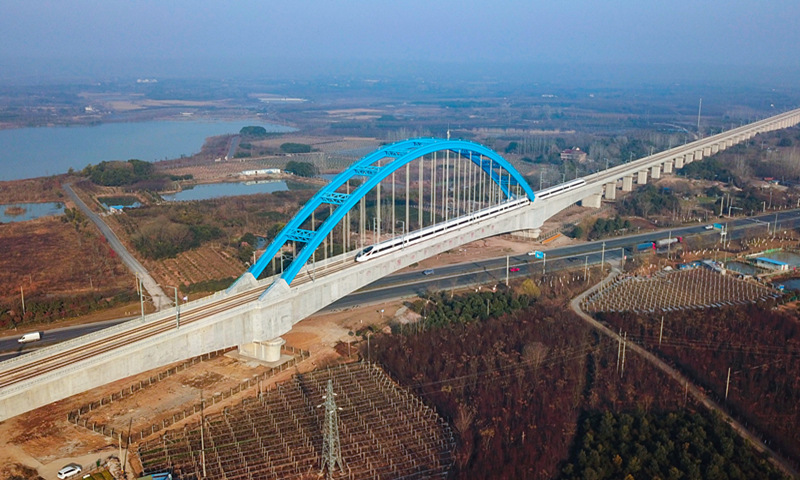 A high-speed train passes the Huagang Bridge in Hefei, East China's Anhui Province on Tuesday, as line linking Hefei and Anqing officially opens. The railway is part of the trunk line known as the Beijing-Hong Kong High-Speed Railway. The new line is 176 kilometers long with a designed speed of 350 kilometers per hour. It takes only 73 minutes to travel between the cities, with a minimum fare of 82 yuan ($12.5). Photo: VCG