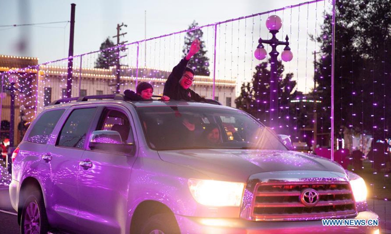 People visit a Christmas-themed drive-thru light show in San Jose, California, the United States, on Dec. 21, 2020. (Photo by Li Jianguo/Xinhua)