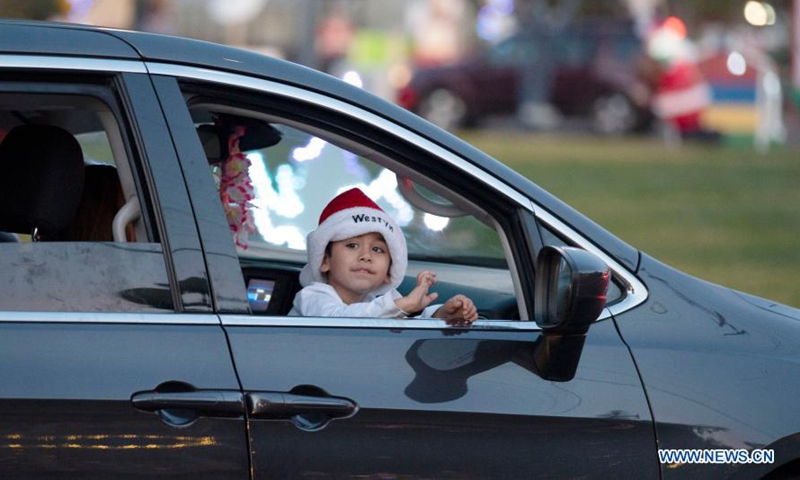 A child is seen in a vehicle to visit a Christmas-themed drive-thru light show in San Jose, California, the United States, on Dec. 21, 2020. (Photo by Li Jianguo/Xinhua)