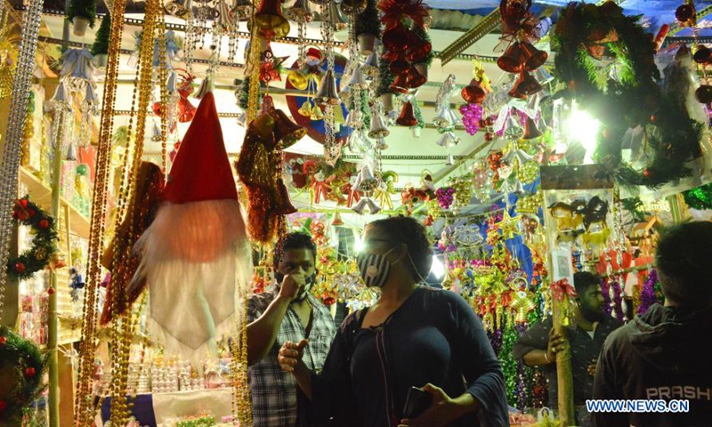 People shop for Christmas decorations at a market in Bangalore, India, Dec. 22, 2020. (Str/Xinhua)