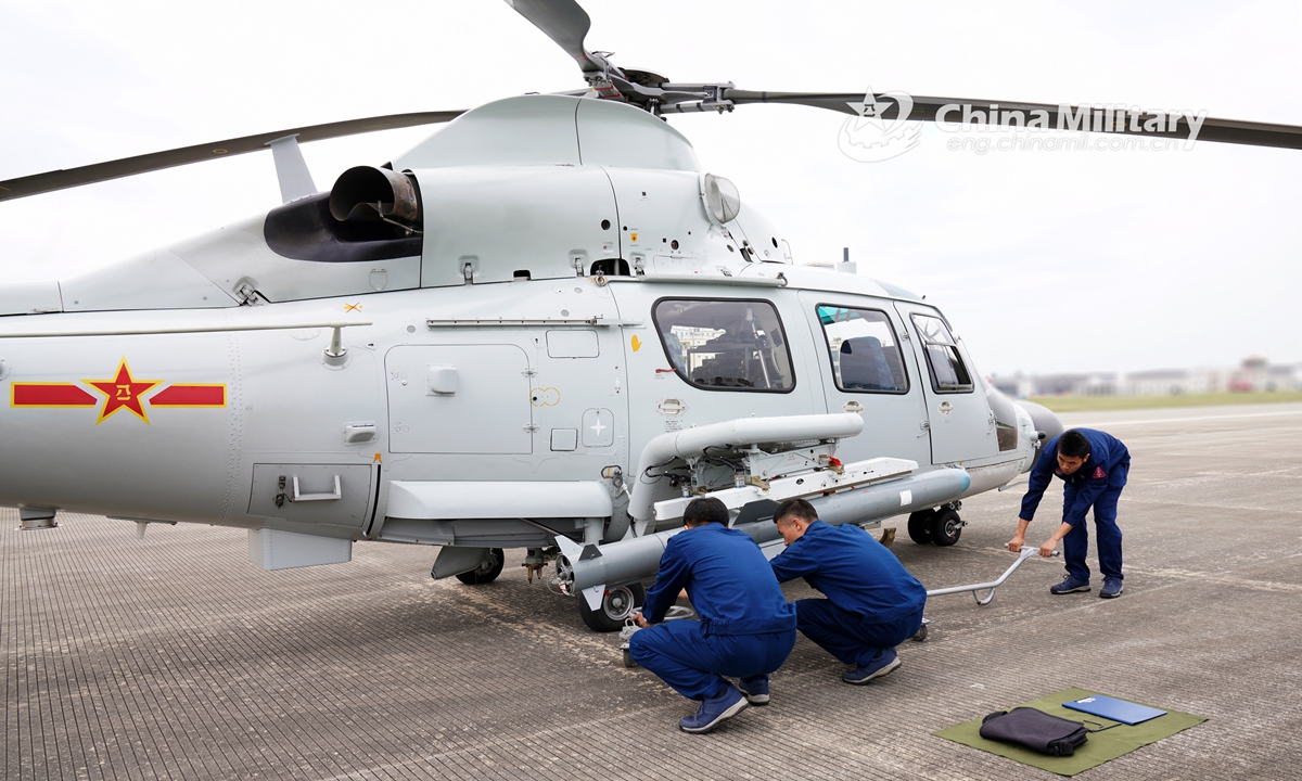 Ground crews assigned to an aviation regiment with the navy under the PLA Southern Theater Command load a missile to the ship-borne Z-9 helicopter during a live-fire training exercise on December 11, 2020. (eng.chinamil.com.cn/Photo by Gao Hongwei)