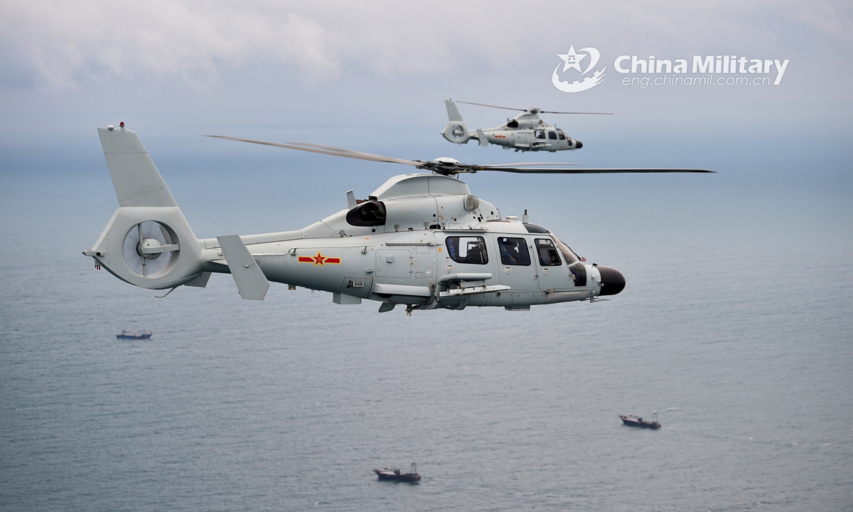 Two ship-borne Z-9 helicopters attached to an aviation regiment with the navy under the PLA Southern Theater Command fly in formation during a live-fire training exercise on December 11, 2020. (eng.chinamil.com.cn/Photo by Gao Hongwei)