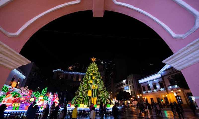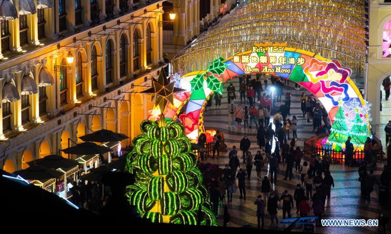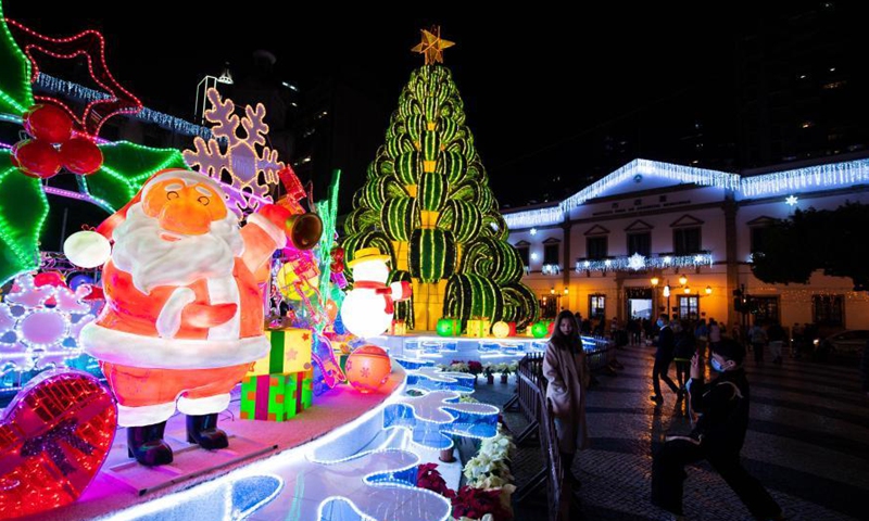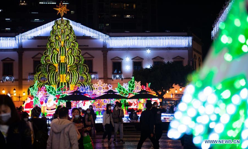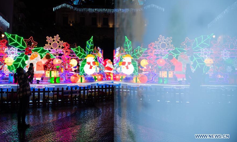 Tourists view the Christmas decorations at the Largo Do Senado in Macao, south China, Dec. 22, 2020. (Xinhua/Cheong Kam Ka)
