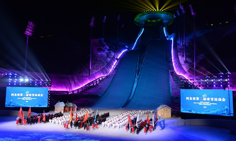 Photo taken on Dec. 21, 2020 shows participants attending the opening ceremony of the second winter sports event of Hebei Province at the National Ski Jumping Center in Chongli District of Zhangjiakou City, north China's Hebei Province. (Xinhua/Jin Haoyuan)