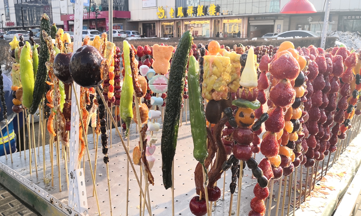 Tanghulu, a traditional Chinese snack usually made of candied fruit, is given a new twist, with sugar-coated cucumbers, chilis, and even moon cakes, becoming a hit among residents in Harbin, Northeast China's Heilongjiang Province. Photo: IC