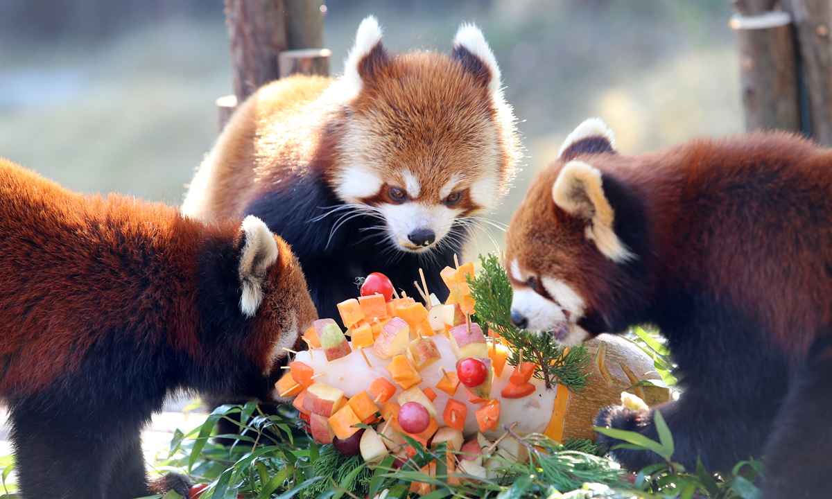 Red pandas enjoy one of the "Christmas feasts" prepared by staff at a safari park in Nantong, East China's Jiangsu Province. Heating systems have also been used at the park to give them a cozy, warm winter. Photo: IC