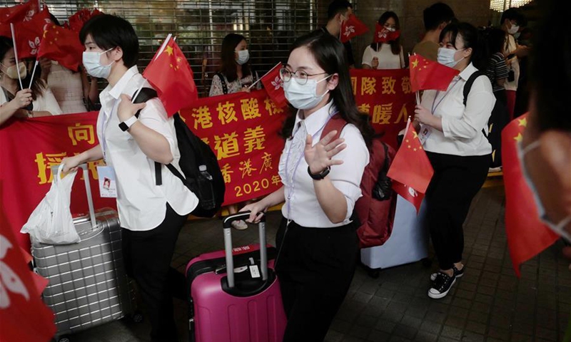 Hong Kong residents see off members of mainland nucleic acid test support teams at their hotel in Hong Kong, south China, Sept. 16, 2020. (Xinhua/Wang Shen)