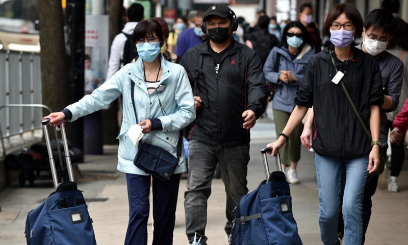 People wearing pace masks walk on the street in south China's Hong Kong, Dec. 10, 2020. Hong Kong reported 112 additional confirmed cases of COVID-19 on Thursday, the third day in a row for the figure to surpass 100. (Xinhua/Lo Ping Fai)
