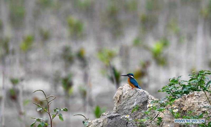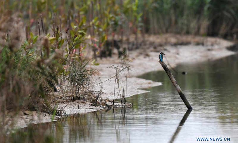 A kingfisher perches beside a mangrove forest at Sanjiang mangrove wetland park in Haikou, south China's Hainan Province, on Dec. 23, 2020. The Dongzhaigang wetland ecological rehabilitation project was accomplished recently, according to the Dongzhaigang National Nature Reserve Authority in Haikou. Kicked off on March 18, 2019, the project aimed to effectively rehabilitate the ecological systems including mangrove forests along the seashore of Dongzhaigang so that migrant birds in the country may find better habitats in winter time. (Xinhua/Yang Guanyu)