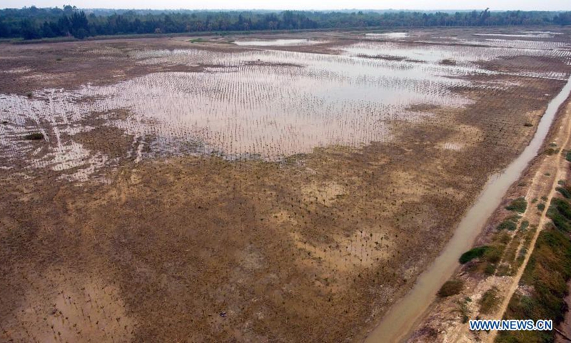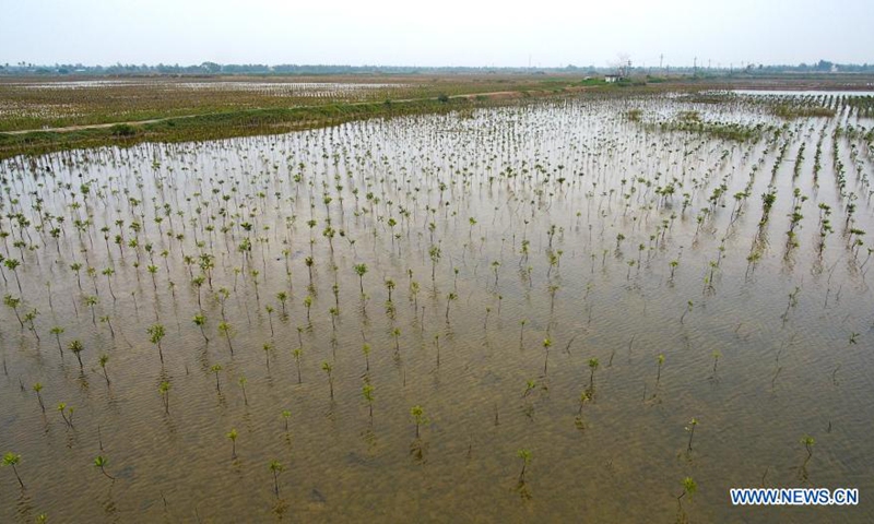 Aerial photo taken on Dec. 23, 2020 shows newly planted mangrove trees at Sanjiang mangrove wetland park in Haikou, south China's Hainan Province. The Dongzhaigang wetland ecological rehabilitation project was accomplished recently, according to the Dongzhaigang National Nature Reserve Authority in Haikou. Kicked off on March 18, 2019, the project aimed to effectively rehabilitate the ecological systems including mangrove forests along the seashore of Dongzhaigang so that migrant birds in the country may find better habitats in winter time. (Xinhua/Yang Guanyu)