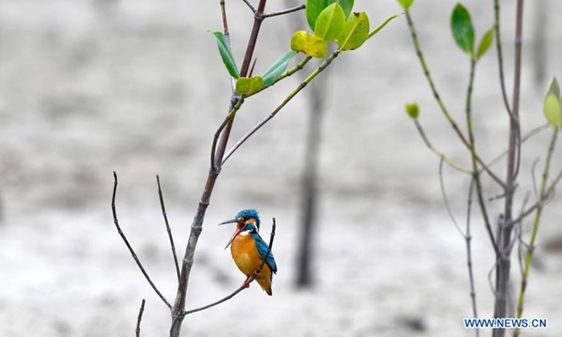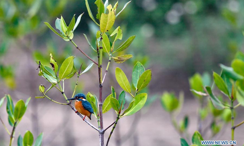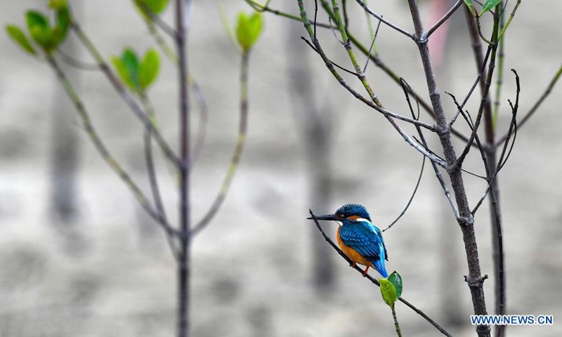 A kingfisher perches on a mangrove tree at Sanjiang mangrove wetland park in Haikou, south China's Hainan Province, on Dec. 23, 2020. The Dongzhaigang wetland ecological rehabilitation project was accomplished recently, according to the Dongzhaigang National Nature Reserve Authority in Haikou. Kicked off on March 18, 2019, the project aimed to effectively rehabilitate the ecological systems including mangrove forests along the seashore of Dongzhaigang so that migrant birds in the country may find better habitats in winter time. (Xinhua/Yang Guanyu)