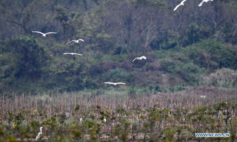 Herons fly over newly planted mangrove trees at Sanjiang mangrove wetland park in Haikou, south China's Hainan Province, on Dec. 23, 2020. The Dongzhaigang wetland ecological rehabilitation project was accomplished recently, according to the Dongzhaigang National Nature Reserve Authority in Haikou. Kicked off on March 18, 2019, the project aimed to effectively rehabilitate the ecological systems including mangrove forests along the seashore of Dongzhaigang so that migrant birds in the country may find better habitats in winter time. (Xinhua/Yang Guanyu)