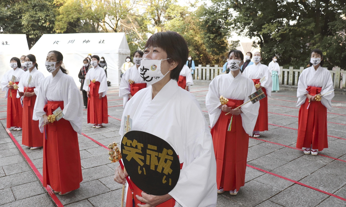 People wearing face masks on which the Chinese character meaning "smile" is written take part in an annual ritual at Hiraoka shrine in Higashiosaka, western Japan, on Wednesday. Participants in the ritual, live broadcast online, roared with laughter three times to "laugh off" bad things that happened in 2020 ahead of the New Year, while maintaining social distancing. Photo: Kyodo News