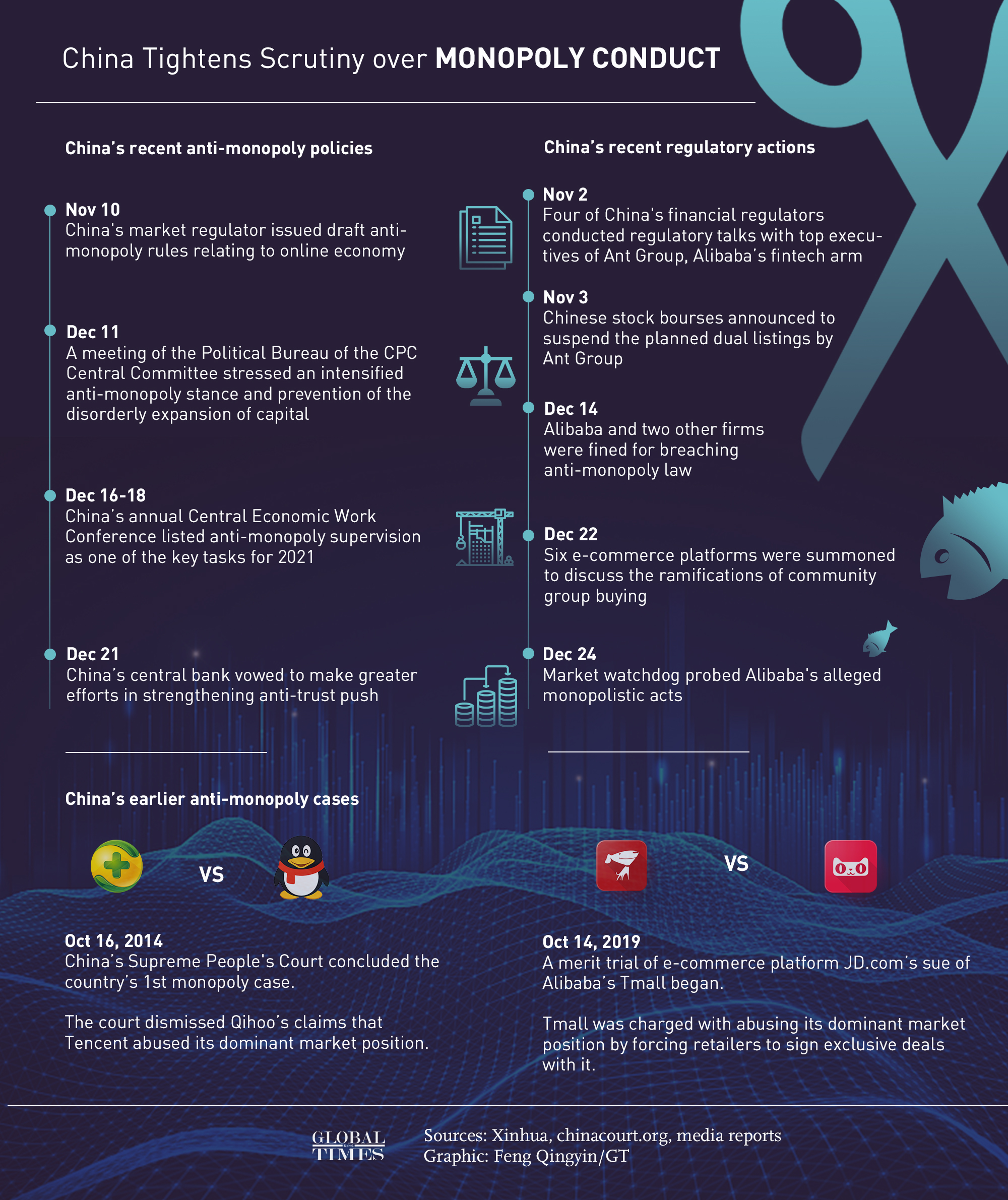 From the first anti-monopoly case between software developer Qihoo and Tencent in 2014 to the latest probe into Alibaba’s alleged monopolistic acts, China is dedicated to creating a better business environment for all of its market participants. Graphic:Feng Qingyin/GT
