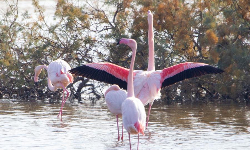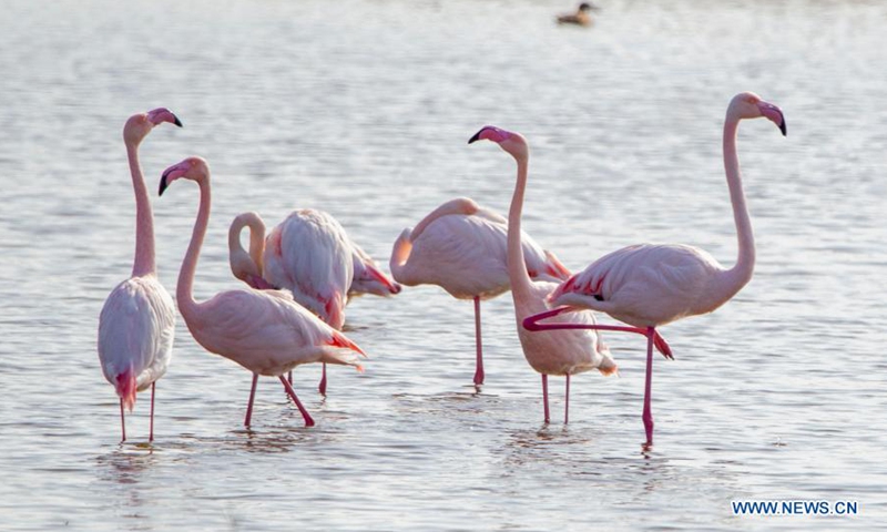 Flamingos are seen in Oroklini Lake, near Larnaca, Cyprus, Dec. 23, 2020. (Photo by George Christophorou/Xinhua)