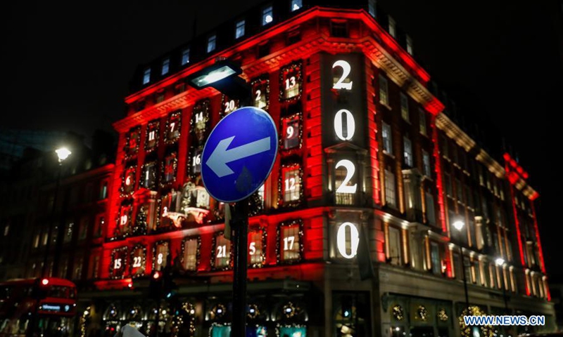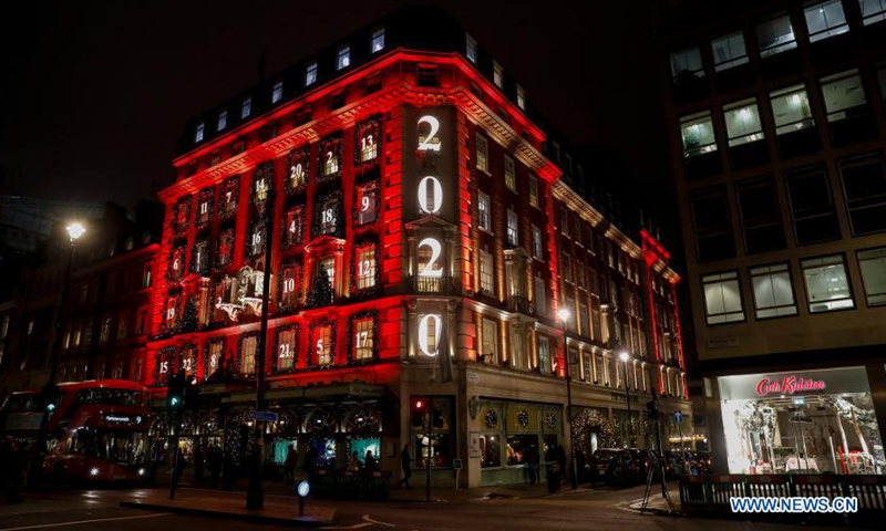 The facade of the Fortnum and Mason food store is seen decorated in the style of an Advent calendar in London, Britain, Dec. 22, 2020. (Xinhua/Han Yan)