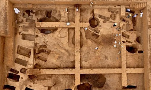 Aerial photo taken on June 5, 2019 shows the family tomb of bronzeware artisans of the Shang Dynasty in Anyang, central China's Henan Province. Archaeologists in central China's Henan Province said they have identified 42 tombs unearthed since 2017 to be a family tomb of bronzeware artisans dating back over 3,000 years. (Photo: Xinhua)