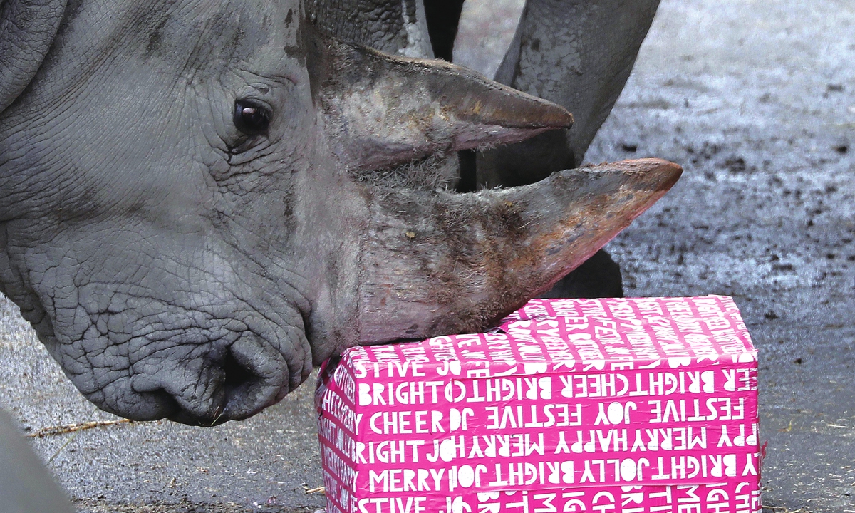 A rhino tries to open a box of Christmas treats during the 10th annual Christmas cracker event at Orana Wildlife Park on the outskirts of Christchurch, New Zealand on Thursday. Locusts, small dead mice and rhino poo were among the special treats handed out to the animals on Christmas Eve. Photo: AFP