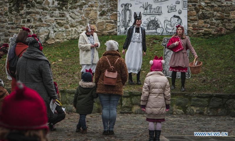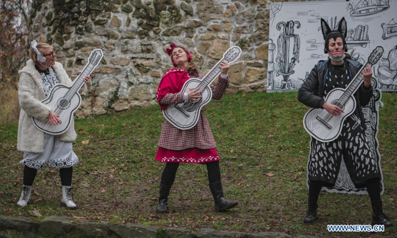Artists of the Poco Loco Theatre perform in an adaptation of the classic tale "Little Red Riding Hood" in a park in Zagreb, Croatia, Dec. 6, 2020. While many theaters in Zagreb canceled performances and premieres in 2020, the Poco Loco Theatre decided to do something new despite the risks and uncertainty. Each Saturday and Sunday, no matter the weather, a park in the center of Zagreb is transformed into a theater stage: a forest where Little Red Riding Hood, her Grandma and a wolf play out their story in an innovative and creative way. (Photo by Kresimir Saric/Xinhua)