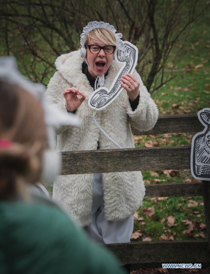 Croatian actress Zrinka Kusevic performs in an adaptation of the classic tale "Little Red Riding Hood" in a park in Zagreb, Croatia, Dec. 6, 2020. While many theaters in Zagreb canceled performances and premieres in 2020, the Poco Loco Theatre decided to do something new despite the risks and uncertainty. Each Saturday and Sunday, no matter the weather, a park in the center of Zagreb is transformed into a theater stage: a forest where Little Red Riding Hood, her Grandma and a wolf play out their story in an innovative and creative way. (Photo by Kresimir Saric/Xinhua)