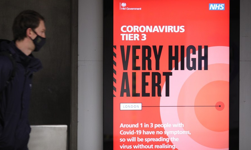 A person walks past a sign at Waterloo Underground Station in London, Britain, on Dec. 16, 2020. (Photo by Tim Ireland/Xinhua)