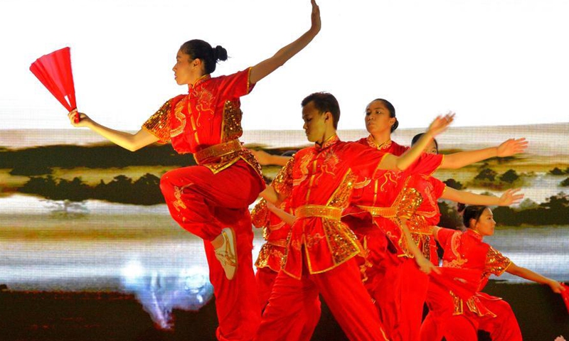 Students perform Chinese singing and dancing during the opening ceremony of China Day cultural carnival in Bandar Seri Begawan, capital of Brunei, on Dec. 26, 2020. (Photo by Jeffrey Wong/Xinhua)