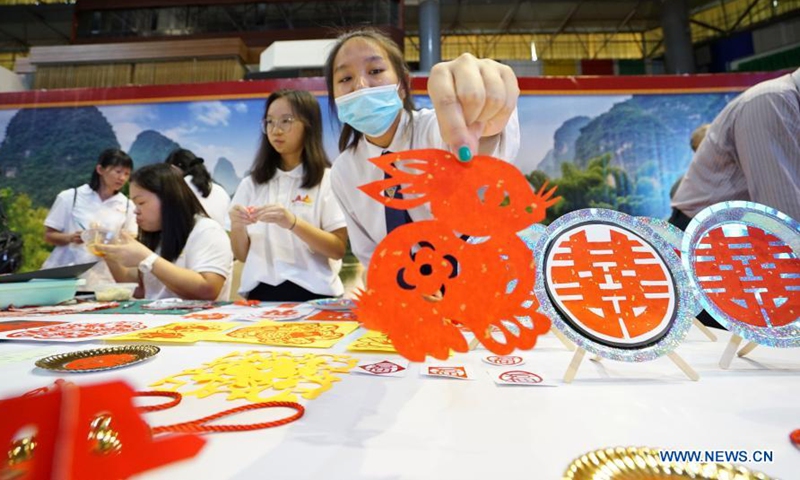 Local people display Chinese paper cutting during the opening ceremony of China Day cultural carnival in Bandar Seri Begawan, capital of Brunei, on Dec. 26, 2020. (Photo by Jeffrey Wong/Xinhua)