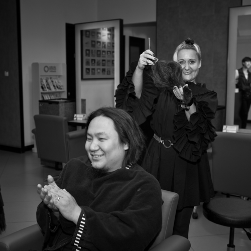 "Just don't make him look younger than me," joked his wife, Qin Qihui, as she intently watched Beijing stylist, Scarlet Salmons, lop her husband's 32-centimeter locks off at TATA hair salon by the north gate of Workers' Stadium.