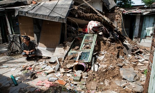 A man squats outside the ruins of his house in Beixin'an, Shijingshan district Sunday. His home collapsed on Saturday evening around 7 pm during the torrential downpour. No one was injured. Photo: Li Hao/GT Beijing is counting the cost in lives and in cash in the aftermath of the biggest storm to hit the city for decades.