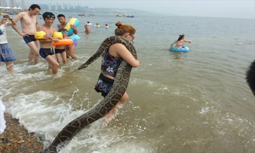 A woman was surrounded by gawkers when she went swimming on a beach in Dalian, Northeast China's Liaoning Province, with a python whose length was about four meters.