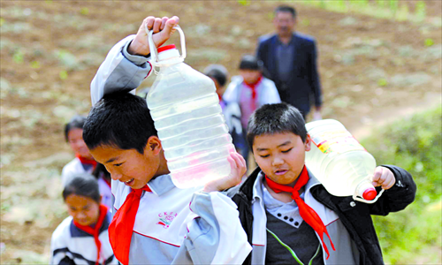 Third-grader Liu Hongli spends half an hour walking to school every day. She said that when the weather was really dry, teachers had to drive a truck long distances to collect water. At home there was no tap water either, so villagers had to get water from a well.