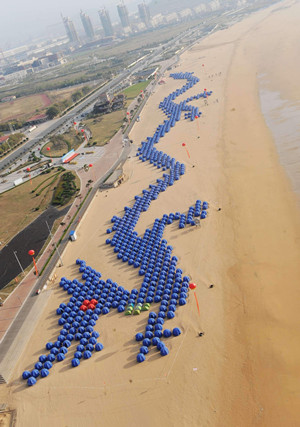 A total of 900 tents form the image of a dragon on a beach in Qingdao, Shandong Province on Saturday. Workers from the Guinness World Records went to the scene and certified the dragon as the world’s largest tent diagram. Photo: CFP