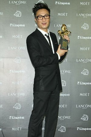 Hong Kong actor Ronald Cheng poses for photos of his trophy of the Best Supporting Actor award for the film "Vlgaria" at the 49th Golden Horse Film Awards in Ilan County, southeast China's Taiwan, November 24, 2012. Photo: Xinhua