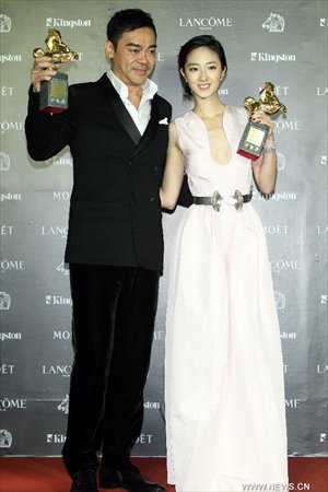 Hong Kong actor Lau Ching Wan (L) and Taiwan actress Gwei Lun-Mei celebrate winning the Best Leading Actor and Best Leading Actress respectively at the 49th Golden Horse Film Awards in Ilan County, southeast China's Taiwan, November 24, 2012. Photo: Xinhua
