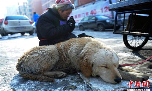 A dog helps his disabled owner sell traditional candied fruits (Bingtanghulu) by pulling his cart in Changchun, capital of Northeast China’s Jilin Province on February 6, 2013. The dog’s owner explained he learnt to make Bingtanghulu so he wouldn’t have to rely on anyone to make a living. His dog, “Big Yellow”, has never left his side and pulls his cart every day.