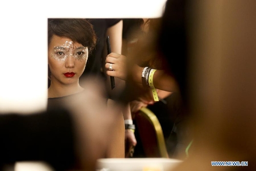 Chinese actress Wang Luodan gets her make-up done at the backstage before the presentation of Jenny Ji's fashion show during London Fashion Week in London, Britain, on February 18, 2013. (Xinhua/Tang Shi)