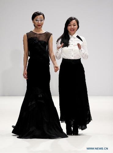 Chinese actress Wang Luodan (L) and Chinese designer Jenny Ji greet to audience after Jenny Ji's fashion show during London Fashion Week in London, Britain, on February 18, 2013. (Xinhua/Tang Shi)