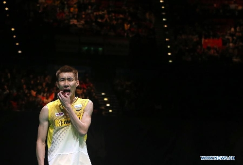 Malaysia's Lee Chong Wei reacts during his men's singles final match against China's Chen Long at the 2013 Yonex All England Open Badminton Championships, in Birmingham, Britain, March 10, 2013. Chen Long won 2-0 to claim the titel.(Xinhua/Yin Gang)