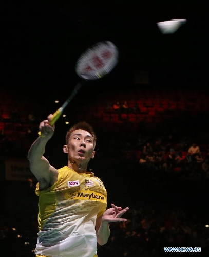 Malaysia's Lee Chong Wei returns the shot during his men's singles final match against China's Chen Long at the 2013 Yonex All England Open Badminton Championships, in Birmingham, Britain, March 10, 2013. Chen Long won 2-0 to claim the titel.(Xinhua/Yin Gang)