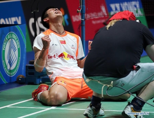 China's Chen Long(Back) celebrates after winning his men's singles final match against Malaysia's Lee Chong Wei at the 2013 Yonex All England Open Badminton Championships, in Birmingham, Britain, March 10, 2013. Chen Long won 2-0 to claim the titel.(Xinhua/Yin Gang)