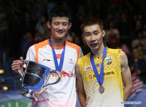 China's Chen Long(left) poses at the awarding ceremony with Malaysia's Lee Chong Wei after their singles final match at the 2013 Yonex All England Open Badminton Championships, in Birmingham, Britain, March 10, 2013. Chen Long won 2-0 to claim the titel.(Xinhua/Yin Gang)
