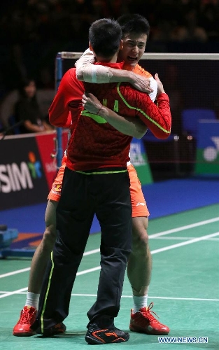 China's Chen Long(left) celebrates after winning his men's singles final match against Malaysia's Lee Chong Wei at the 2013 Yonex All England Open Badminton Championships, in Birmingham, Britain, March 10, 2013. Chen Long won 2-0 to claim the titel.(Xinhua/Yin Gang)