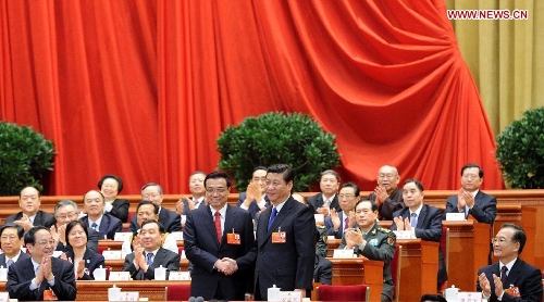 Xi Jinping (R) shakes hands with Li Keqiang at the fifth plenary meeting of the first session of the 12th National People's Congress (NPC) at the Great Hall of the People in Beijing, capital of China, March 15, 2013. Li Keqiang was endorsed as the premier of China's State Council at the meeting here on Friday. (Xinhua/Lan Hongguang)